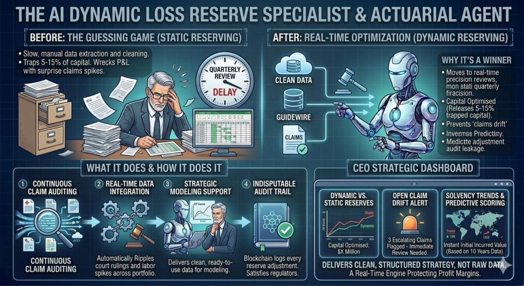 This agent continuously audits open claims, recalculating the necessary reserve for every file based on new incoming data—medical reports, legal filings, or even weather patterns—rather than waiting for a manual actuarial update.